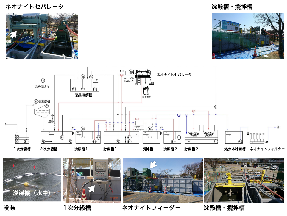 天然鉱物を使用したネオナイト除染剤を使用したネオナイト工法は排水・汚泥・土壌・廃棄物処理に多くの実績があり自然にやさしい工法です。脱水装置(ネオナイトセパレーター)やろ布式の重力脱水装置にて脱水減容化を行ないます。 脱水に伴い発生した汚染水は、天然素材を原料とするネオナイト(除染剤)を使用し、検出限界値以下まで放射性物質を取り除き安全な水を放流します。