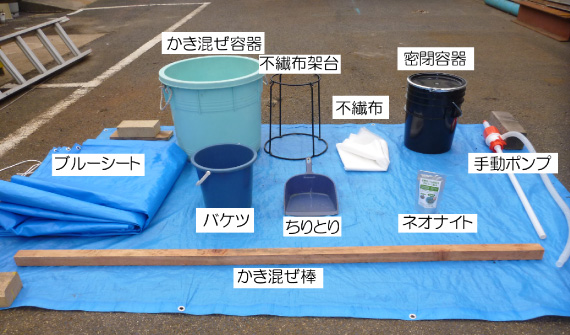 (3)ネオナイト(錠剤)開封後バケツに入れ攪拌棒を使い5~10分間程度攪拌する。