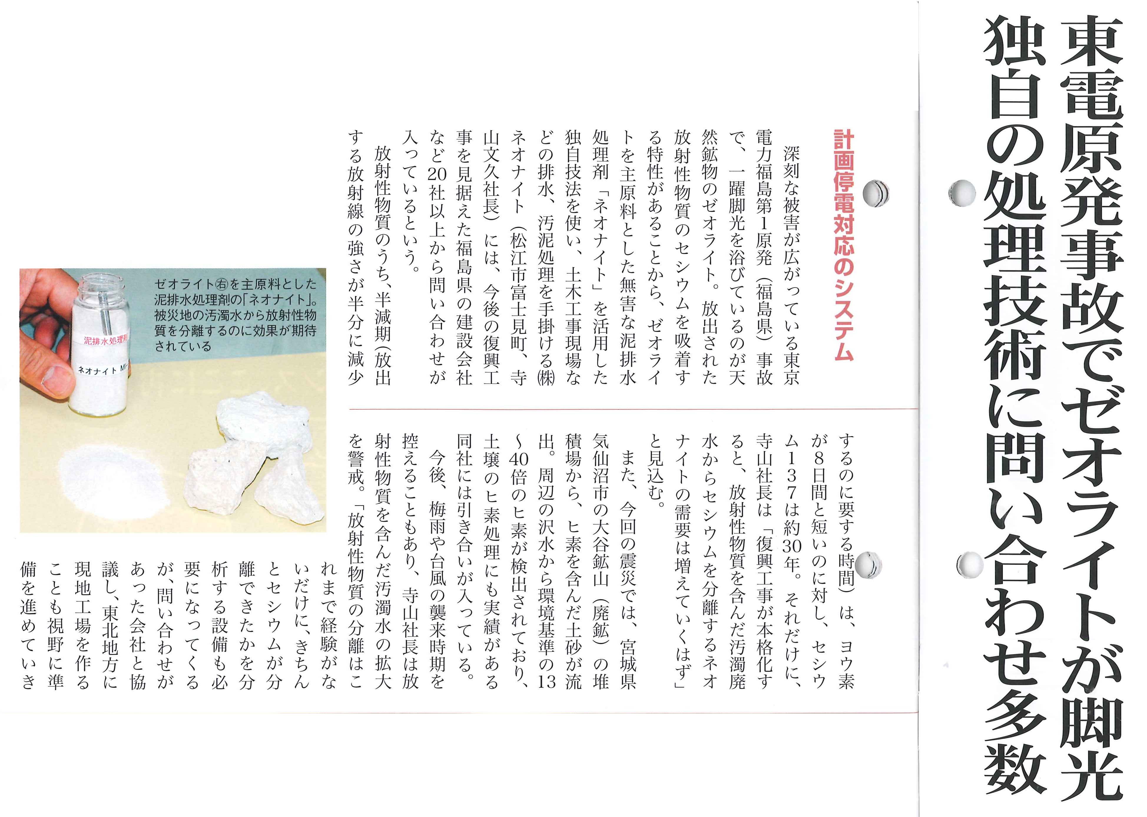 東電原発事故でゼオライトが脚光独自に処理技術に問い合わせ多数・・・・・ 記事を参照して下さい %E5%B1%B1%E9%99%B0%E7%B5%8C%E6%B8%88%E3%82%A6%E3%82%A4%E3%83%BC%E3%82%AF%E3%83%AA%E3%83%BC%E3%80%80%E5%B9%B3%E6%88%90%EF%BC%92%EF%BC%93%E5%B9%B4%EF%BC%95%E6%9C%88%EF%BC%93%E3%83%BB%EF%BC%91%EF%BC%90%E6%97%A5%E5%90%88%E4%BD%B5%E5%8F%B7%EF%BC%92.jpg