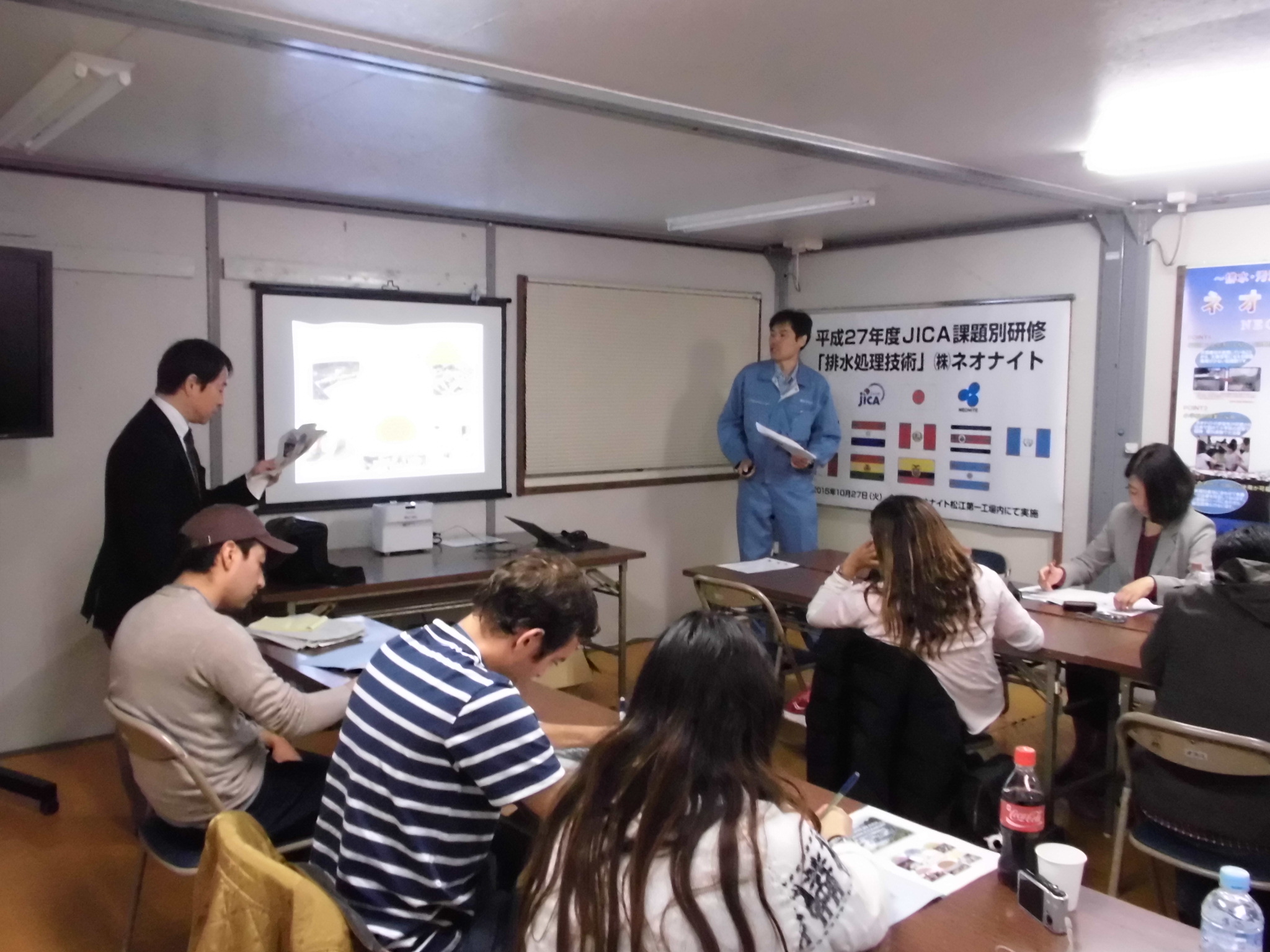 10月27日、国際協力機構(JICA)が主催する課題別研修「排水処理技術」の一部として、中南米地域からの技術者の方に、排水処理の研修を行いました。中南米の技術者9名、通訳・引率者2名、合計11名が弊社第1工場を訪問しました。